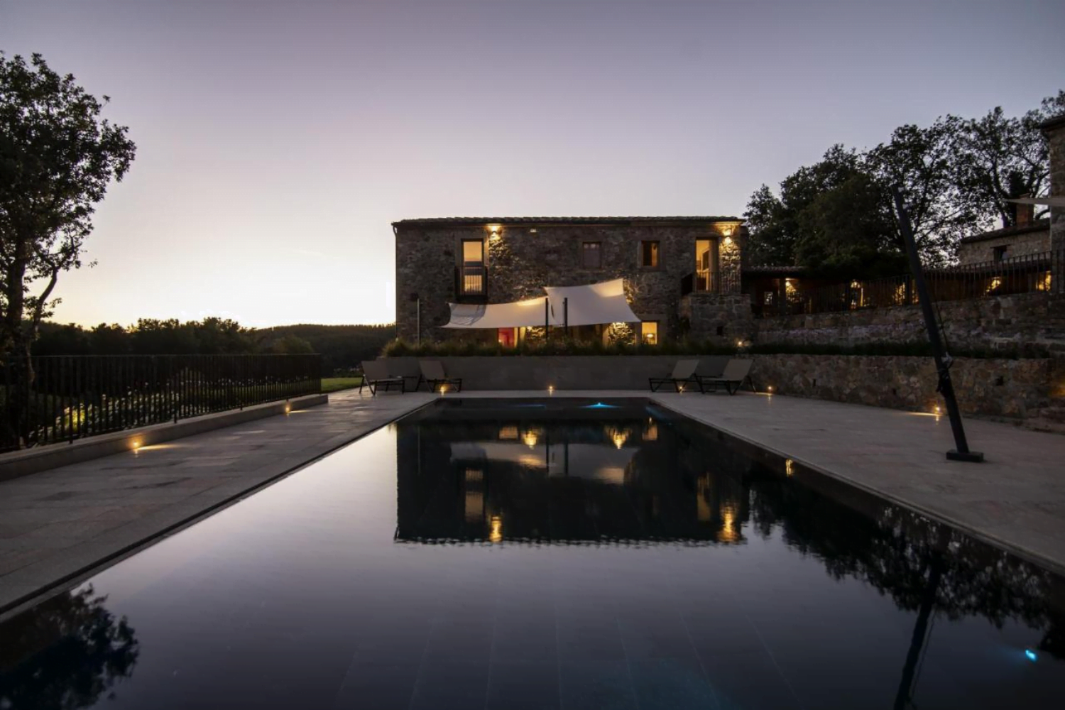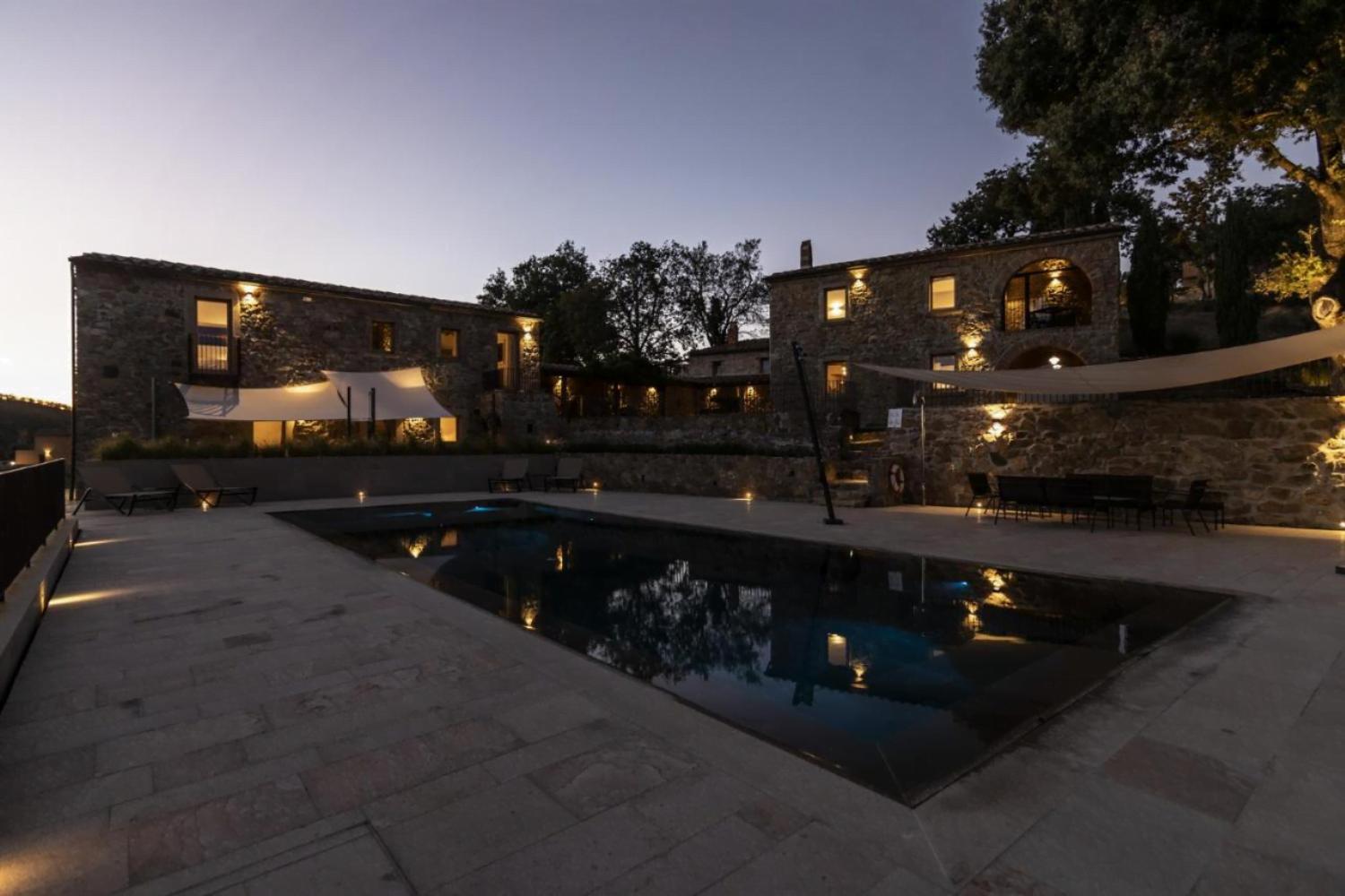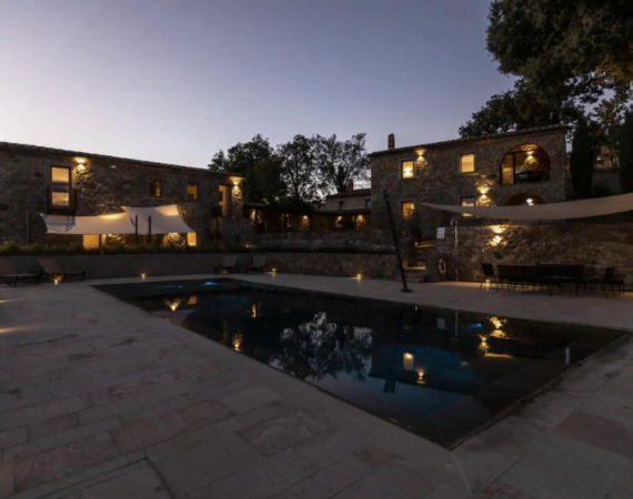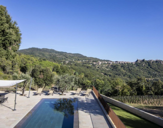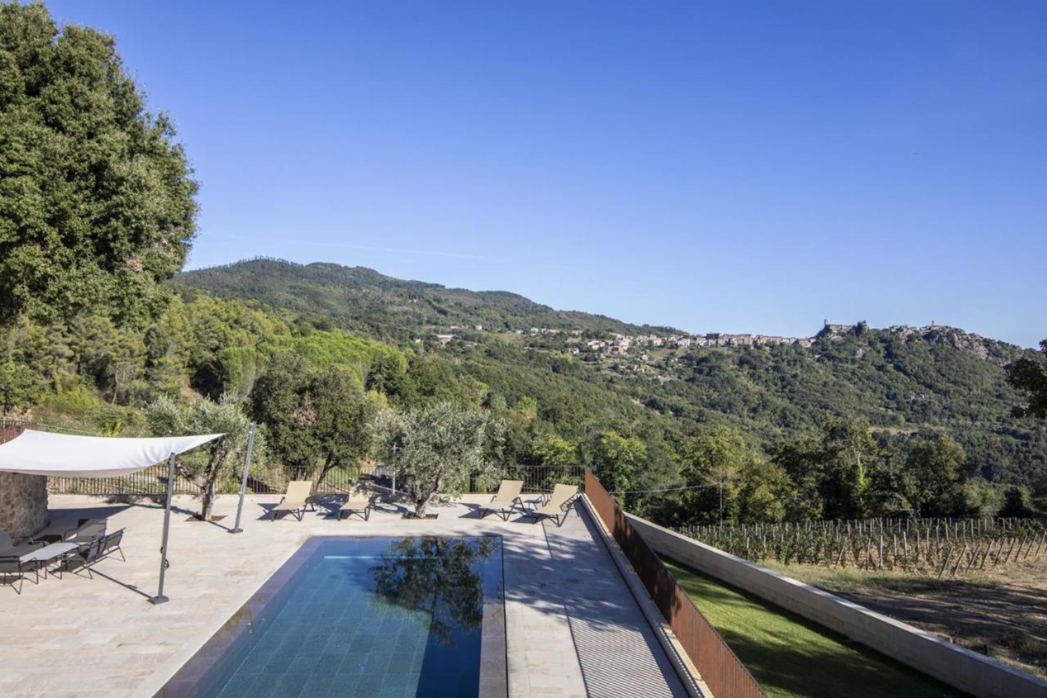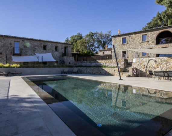 Torre a Cona Wine Estate - Hotel in Italié buitenzwembad met ligstoelen.
